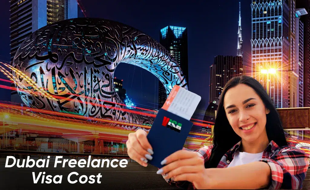 A woman holding a passport and ticket, smiling with Dubai city buildings and the Museum of the Future in the background; text reads "Dubai Freelance Visa Cost.
