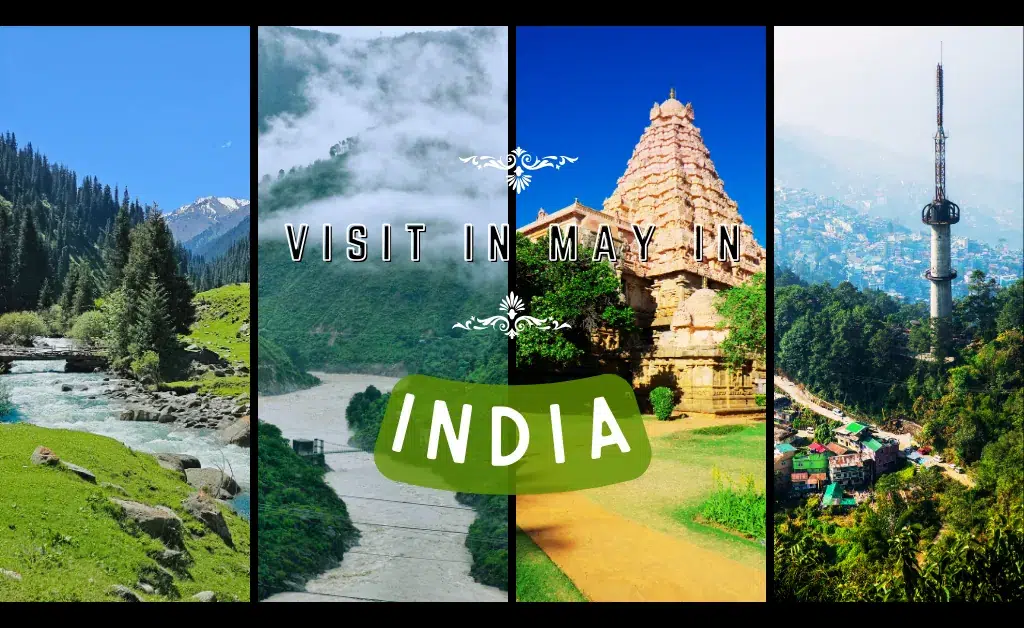 A split image shows scenic landscapes, a temple, and a city with mountains, with text: “Visit in May in India.”.